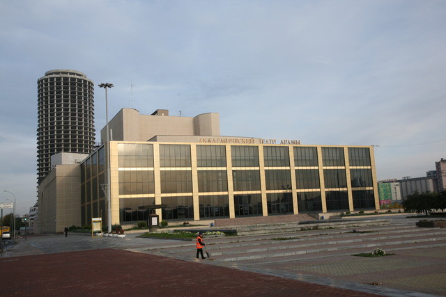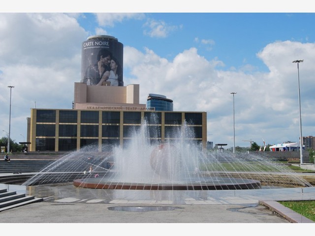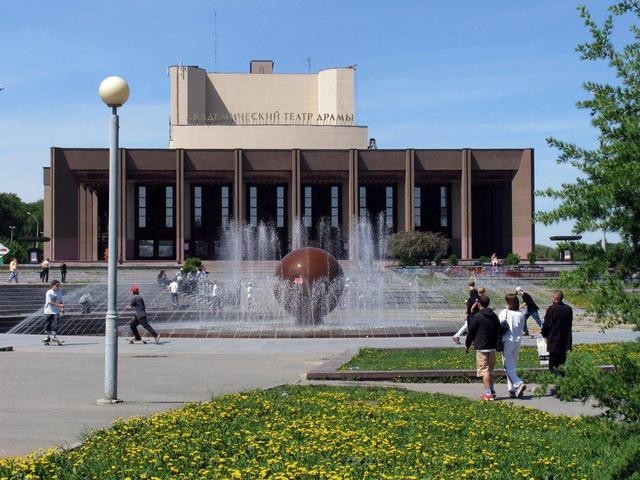 Иногда местные жители называют это место не Октябрьской, а Театральной площадью. Удивительно, как быстро закрепилось за ней это неофициальное название. Ведь сам Театр драмы переехал в здание, расположенное здесь, только в 1990 году. Как таковой он существовал еще с тридцатых годов прошлого столетия, в 77-ом получил звание академического.